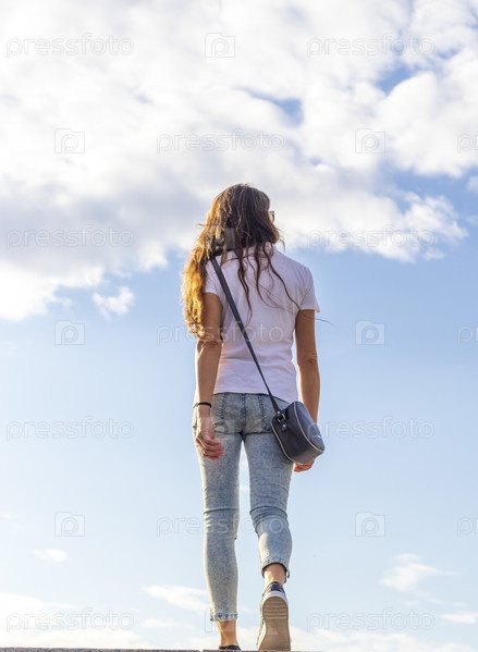 Кадр молодой женщины, поднимающейся по лестнице. Концепция