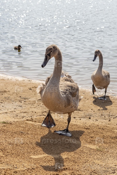 Крупный план лебедей, уток, лебедей у пруда. Пернатый
