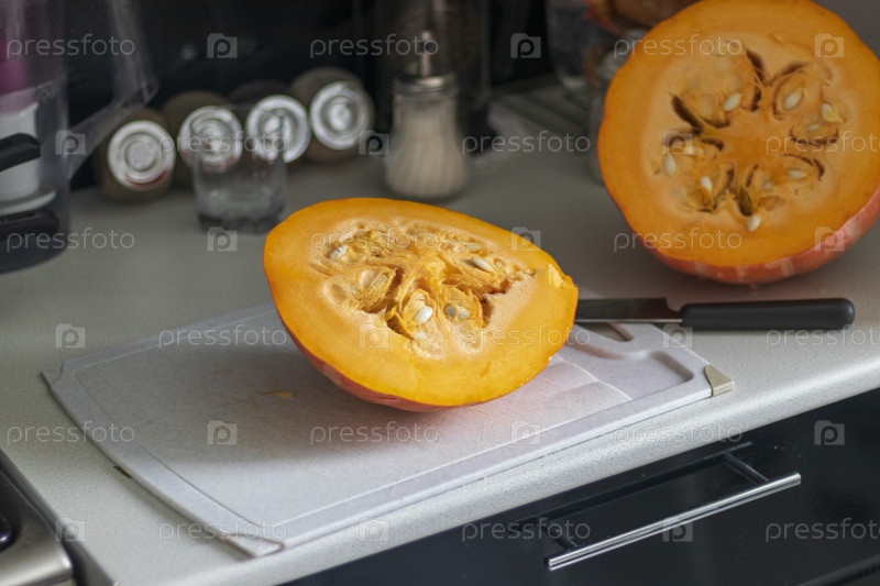Крупный план разрезанной тыквы на столе. Овощной