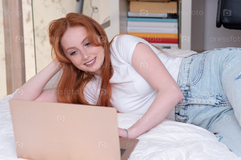Молодая женщина лежит дома с ноутбуком на кровати