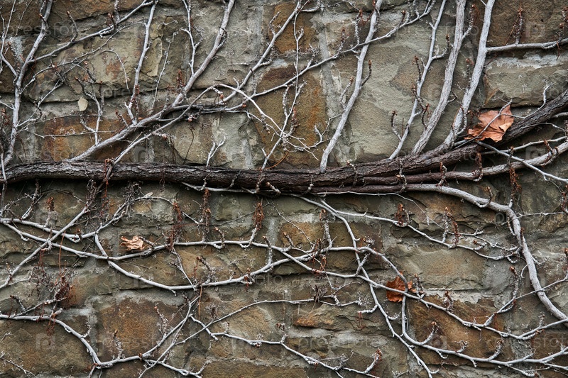 Фон — каменная стена, увитая сухими зимними стеблями дикой лозы