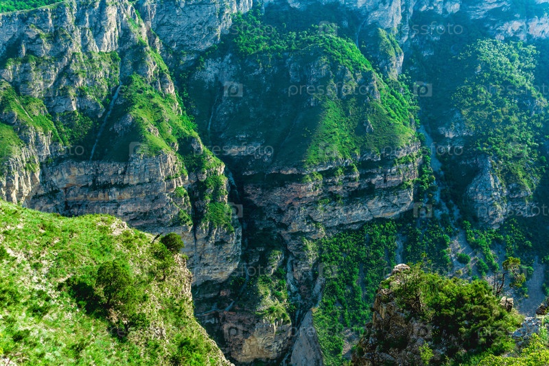 Великолепный горный пейзаж с зелеными скалистыми крутыми склонами огромного естественного каньона