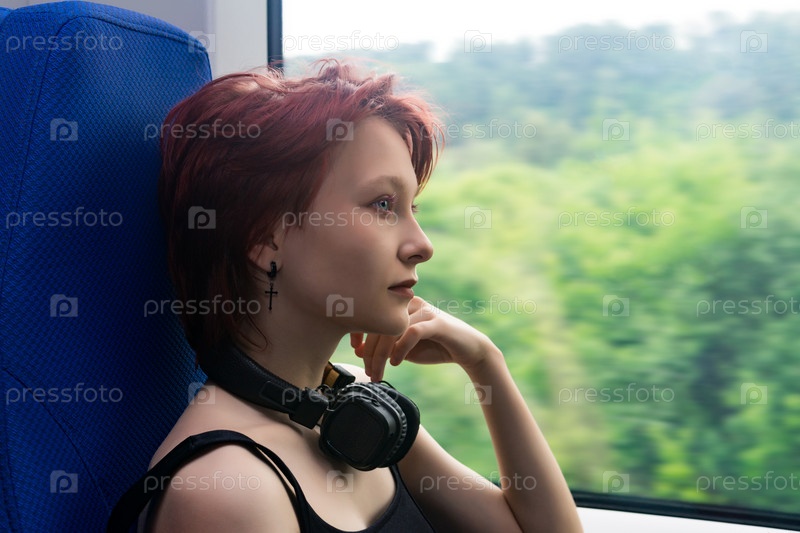 Девушка едет в электричке и смотрит в окно на размытый в движении природный ландшафт