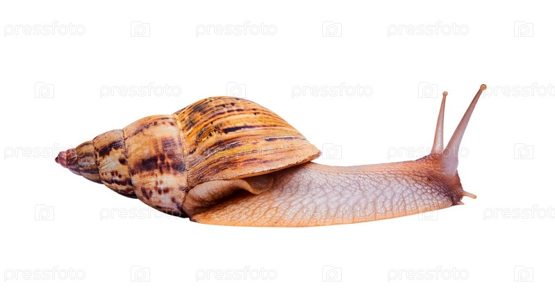 Живая улитка ахатина изолирована на белом фоне, вид сбоку