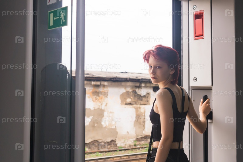 Девочка-подросток готовится выйти на станции из вагона пригородной электрички
