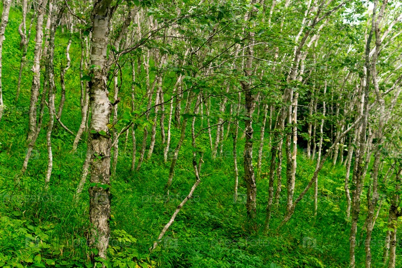 Горный лес с кривыми березами на побережье Тихого океана, Сахалин