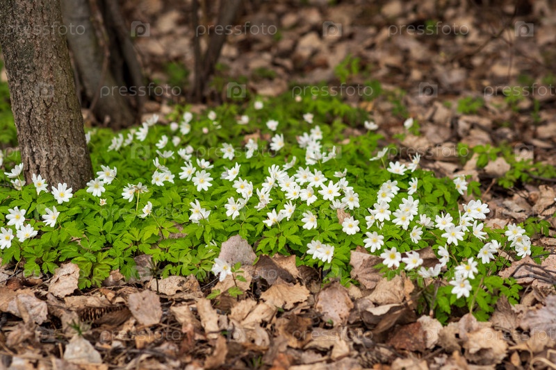 Первые весенние цветы анемоны среди сухой листвы в лесу