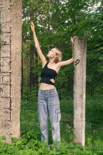 Молодая женщина позирует рядом с бетонными сваями среди природного ландшафта