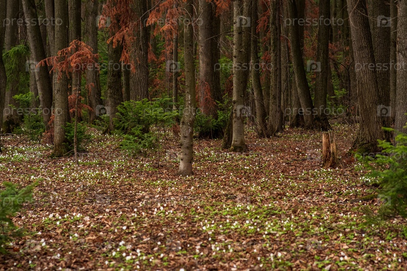 Ранней весной лесной природный пейзаж с первыми цветами древесных анемонов