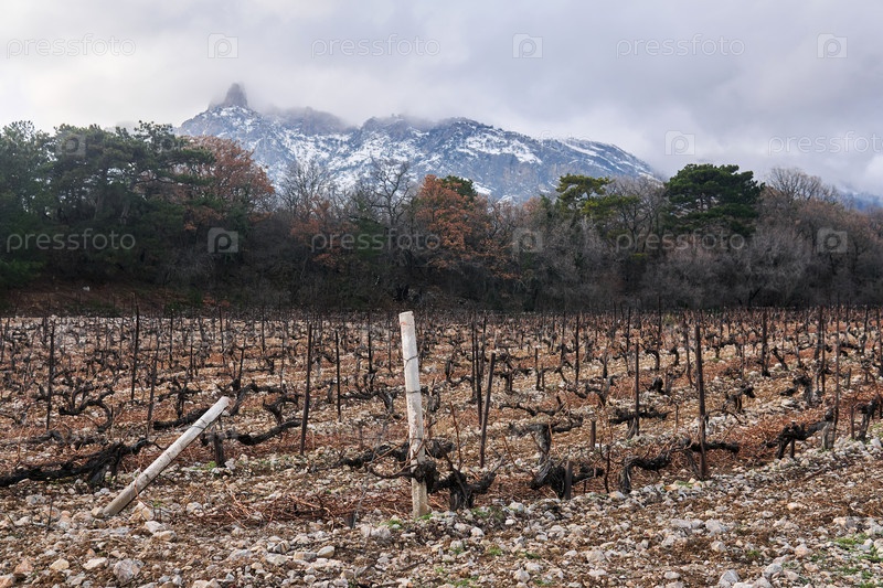 Сухие зимние обрезанные лозы в винограднике на фоне зимних гор