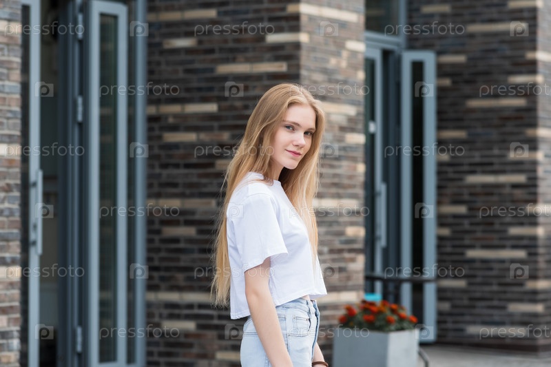 Молодая женщина вышла из двери городского здания на размытом городском фоне