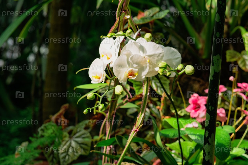 Цветущая орхидея белого мотылька среди тропической растительности
