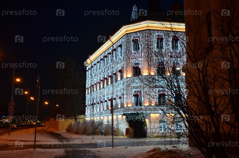Красиво украшенный гирляндами отель на Петроградской набережной в Санкт-Петербурге