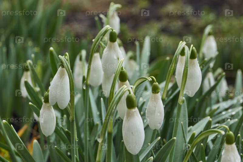 На лужайке в саду цветут подснежники. символ весны. род многолетних трав семейства Амариллидовых (Amaryllidaceae)