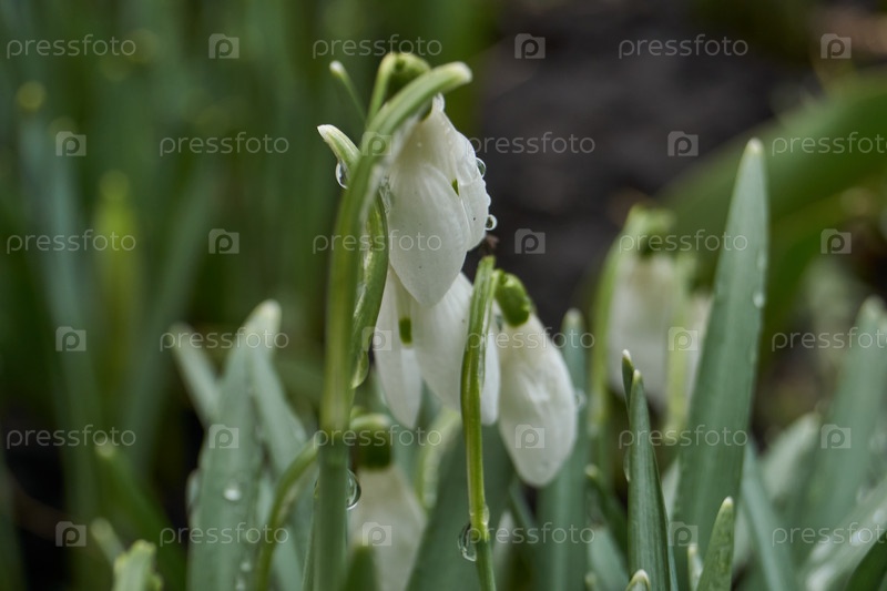 На лужайке в саду цветут подснежники. символ весны. род многолетних трав семейства Амариллидовых (Amaryllidaceae)