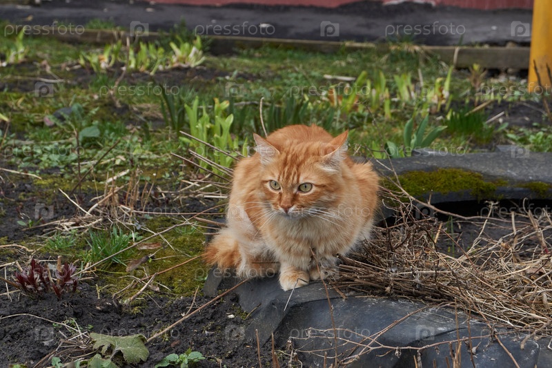 Весна. Бездомный кот гуляет во дворе дома и ждет, пока жители дома его покормят
