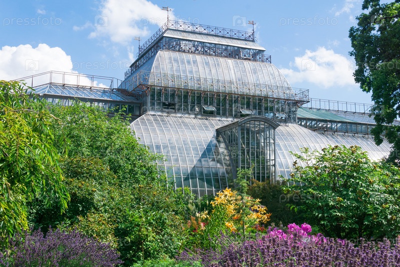 Вид на Ботанический сад Санкт-Петербурга с клумбами и старинной пальмовой оранжереей на заднем плане