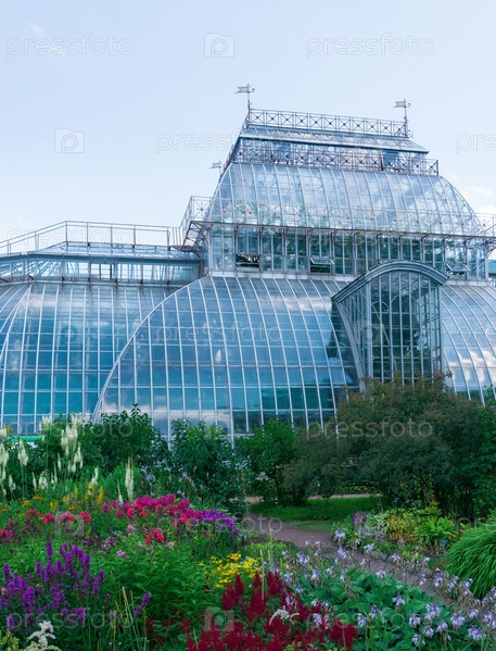 Вид на Ботанический сад Санкт-Петербурга с клумбами и старинной пальмовой оранжереей на заднем плане