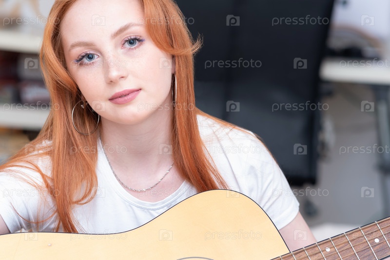 Молодая женщина играет дома на акустической гитаре