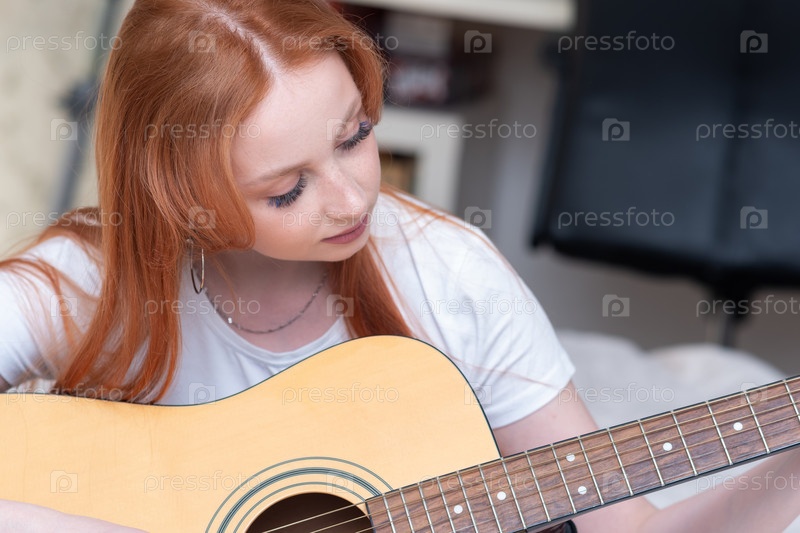 Молодая женщина играет на акустической гитаре дома, портрет крупным планом