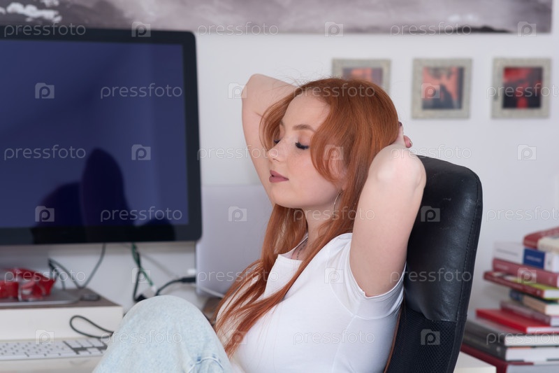 Молодая женщина сидит за столом перед монитором компьютера и отдыхает