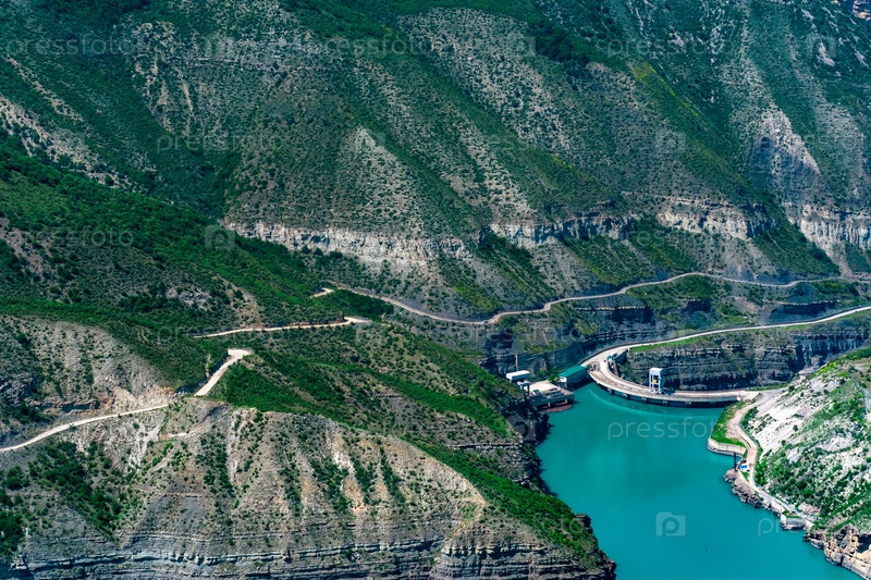 Водохранилище в горном каньоне и верхняя часть арочной плотины ГЭС