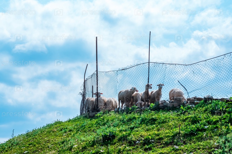 Овцы за сетчатым забором в сельской местности на открытом воздухе