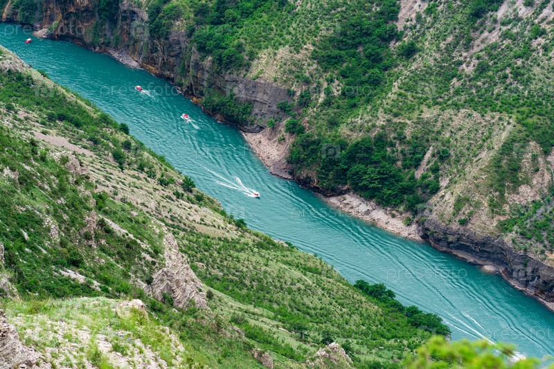 Горный пейзаж с глубоким каньоном с голубой рекой, по которой движется моторная лодка