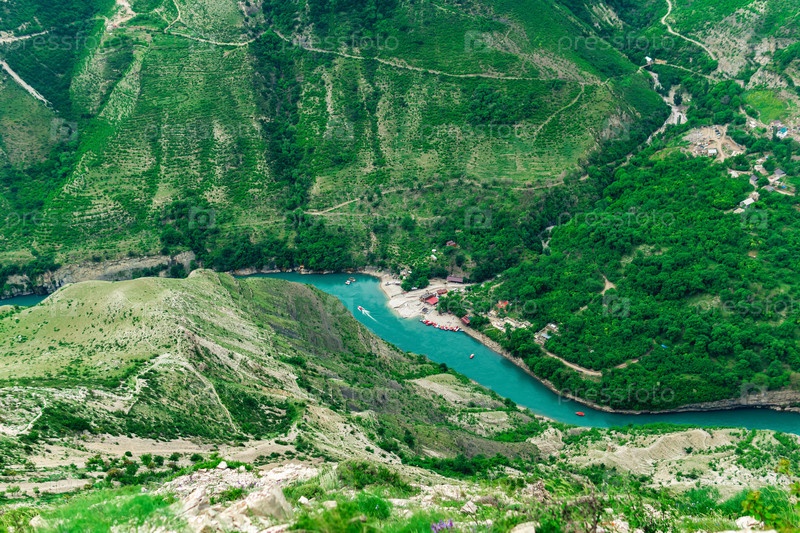 Вид сверху на горную реку Сулак в Дагестане с туристической лодочной базой