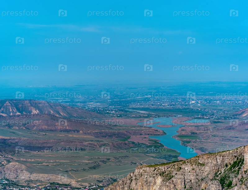 Горный пейзаж на Кавказе с видом на долину реки Сулак и города внизу на равнине