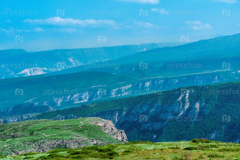 Голубой горный пейзаж на Северном Кавказе со скалистыми крутыми холмами и альпийскими пастбищами