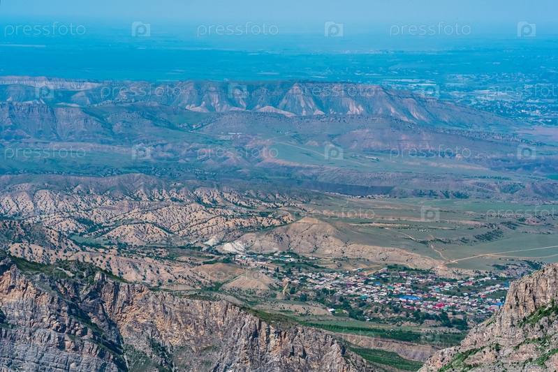 Горный пейзаж на Кавказе с видом на долину реки Сулак и города внизу на равнине