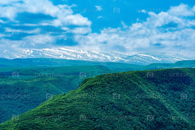 Живописный лесистый альпийский пейзаж с заснеженным горным хребтом на горизонте
