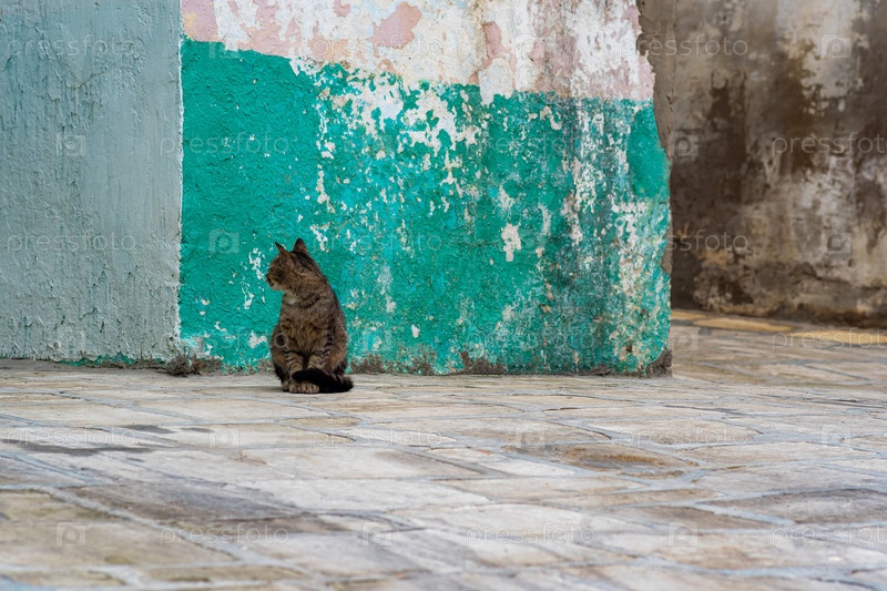 Кот на улице среди бетонных стен сидит, отвернувшись