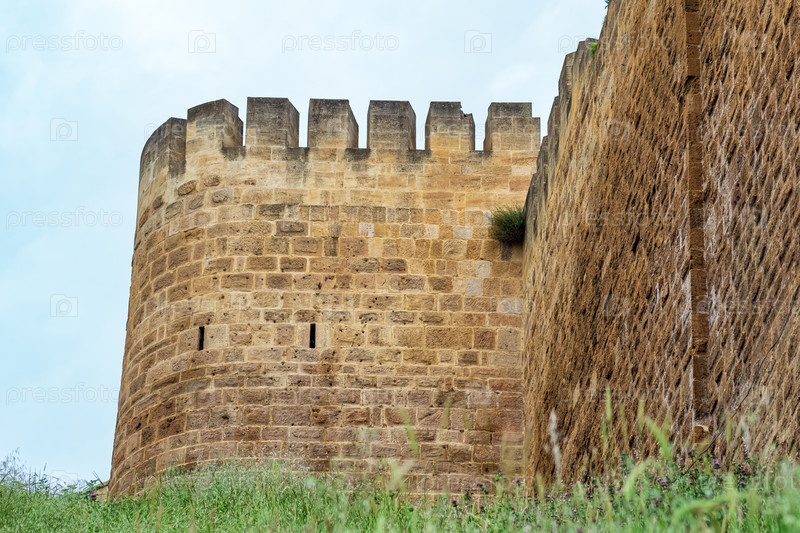 Бастион средневековой крепости над валом, заросшим травой на фоне неба, цитадель Нарын-кала в Дербенте