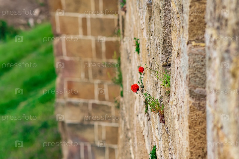 Стена старого замка с цветами мака, растущими в трещинах кладки