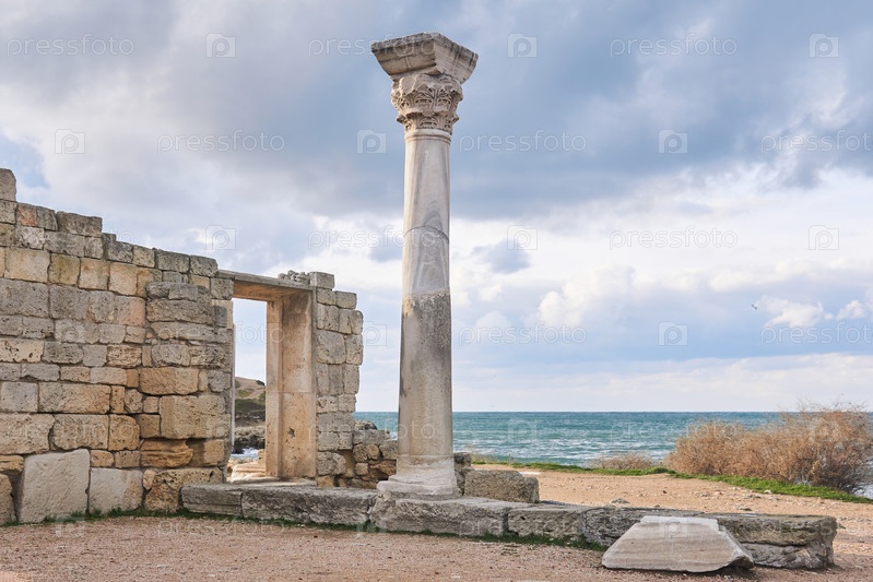 Руины античного греческого храма с колонной на берегу моря