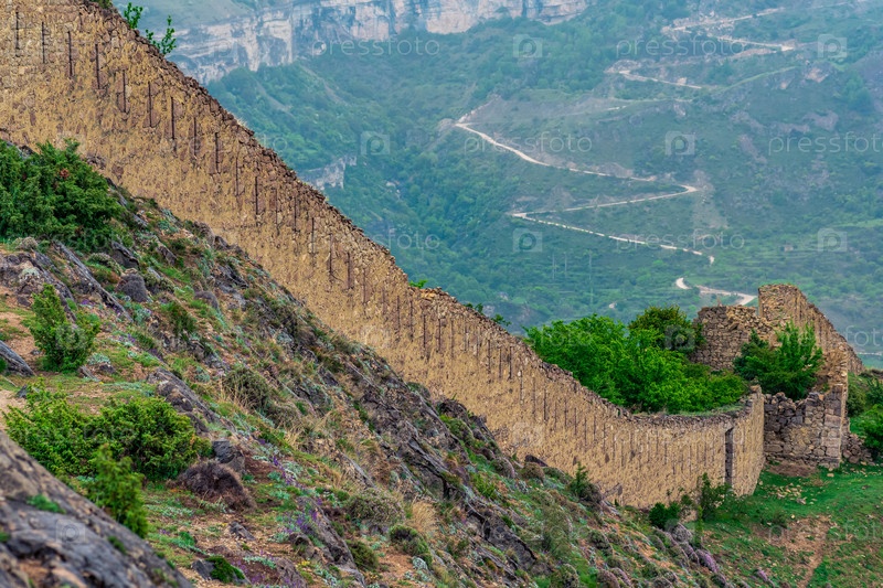 Средневековая крепостная стена на склоне горы, крепость Гуниб (Шамиль) в Дагестане