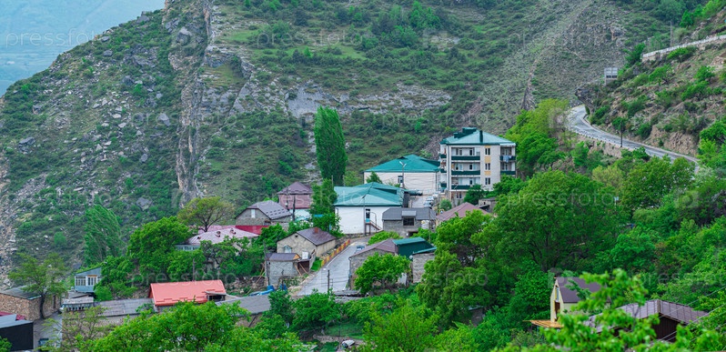 Село рядом с шоссе на перевале, село Гуниб в Дагестане