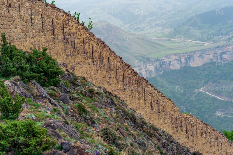 Средневековая крепостная стена на склоне горы, крепость Гуниб (Шамиль) в Дагестане