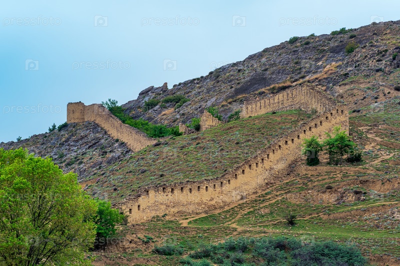 Средневековая крепостная стена на склоне горы, крепость Шамиля (Гуниба) в Дагестане