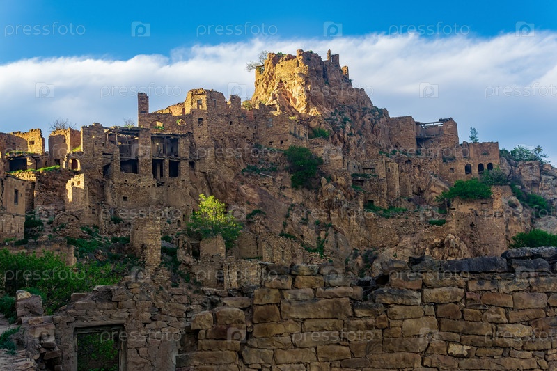 Вечерний вид на необитаемое село Гамсутль на вершине горы в Дагестане