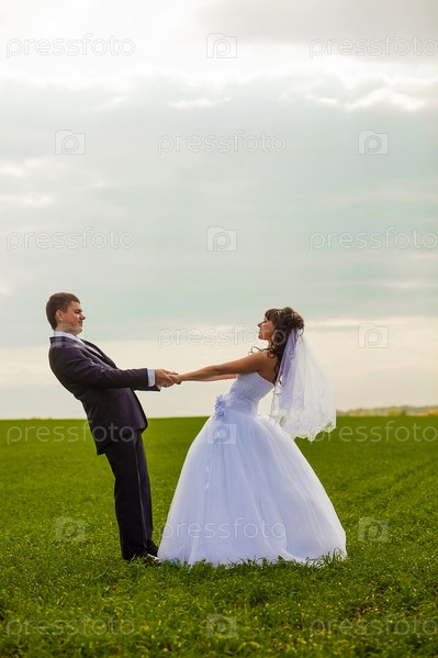 Русские невеста и жених стоят в поле, взявшись за руки на фоне голубого неба