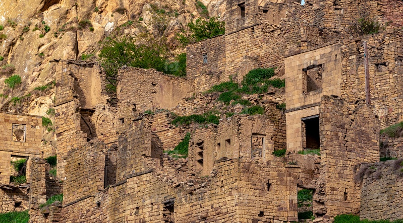 Руины каменных домов, прикрепленных к скале в обезлюдевшей деревне Гамсутль в лучах заката