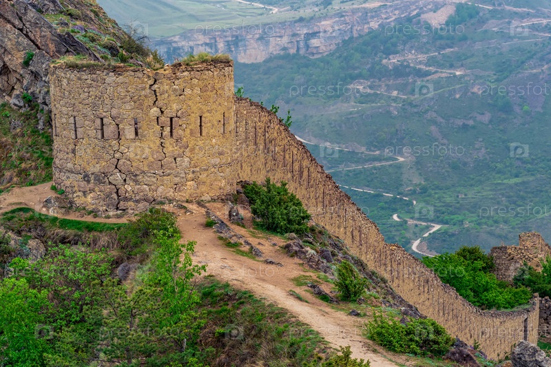 Древняя башня и стена замка на вершине отвесной скалы в горной местности, крепость Шамиля (Гуниба) в Дагестане,