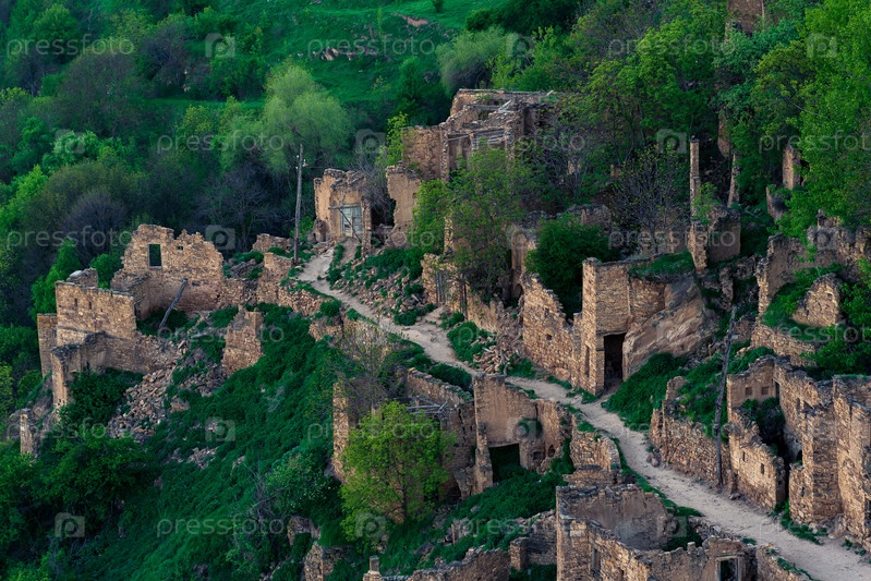 Вид с воздуха на бывшую улицу среди руин заброшенного горного села Гамсутль в Дагестане
