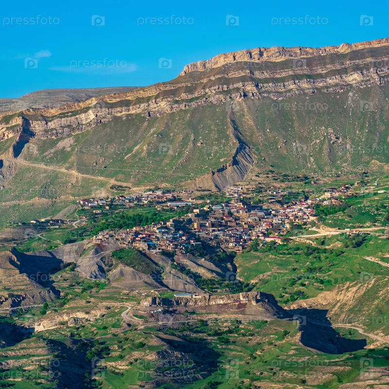 Вид на горное село Чох в Дагестане на склоне обширной долины