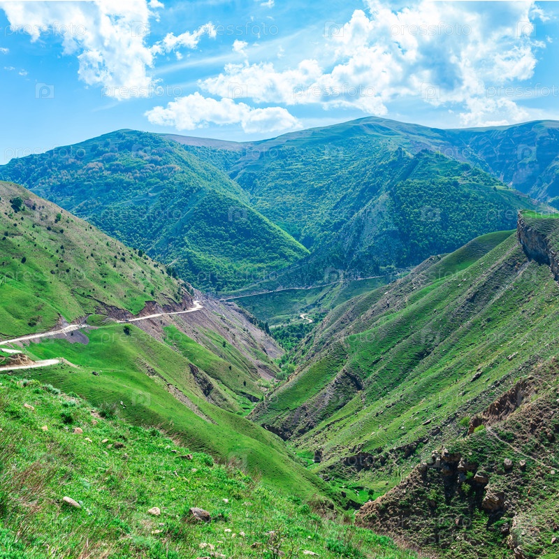Пейзаж горной долины на Кавказе с пересекающей ее дорогой