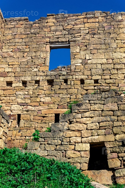 Руины каменной стены на фоне неба в древней заброшенной деревне Гамсутль