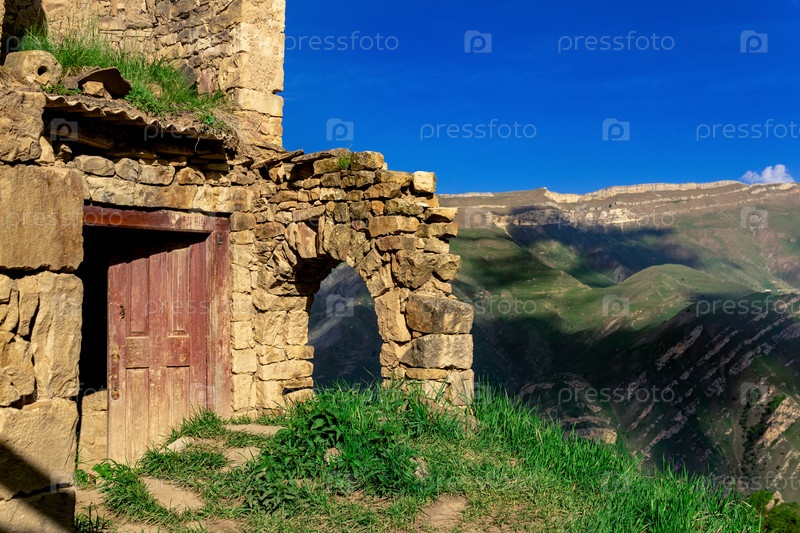 Руины дома в заброшенной деревне Гамсутль с видом на горы